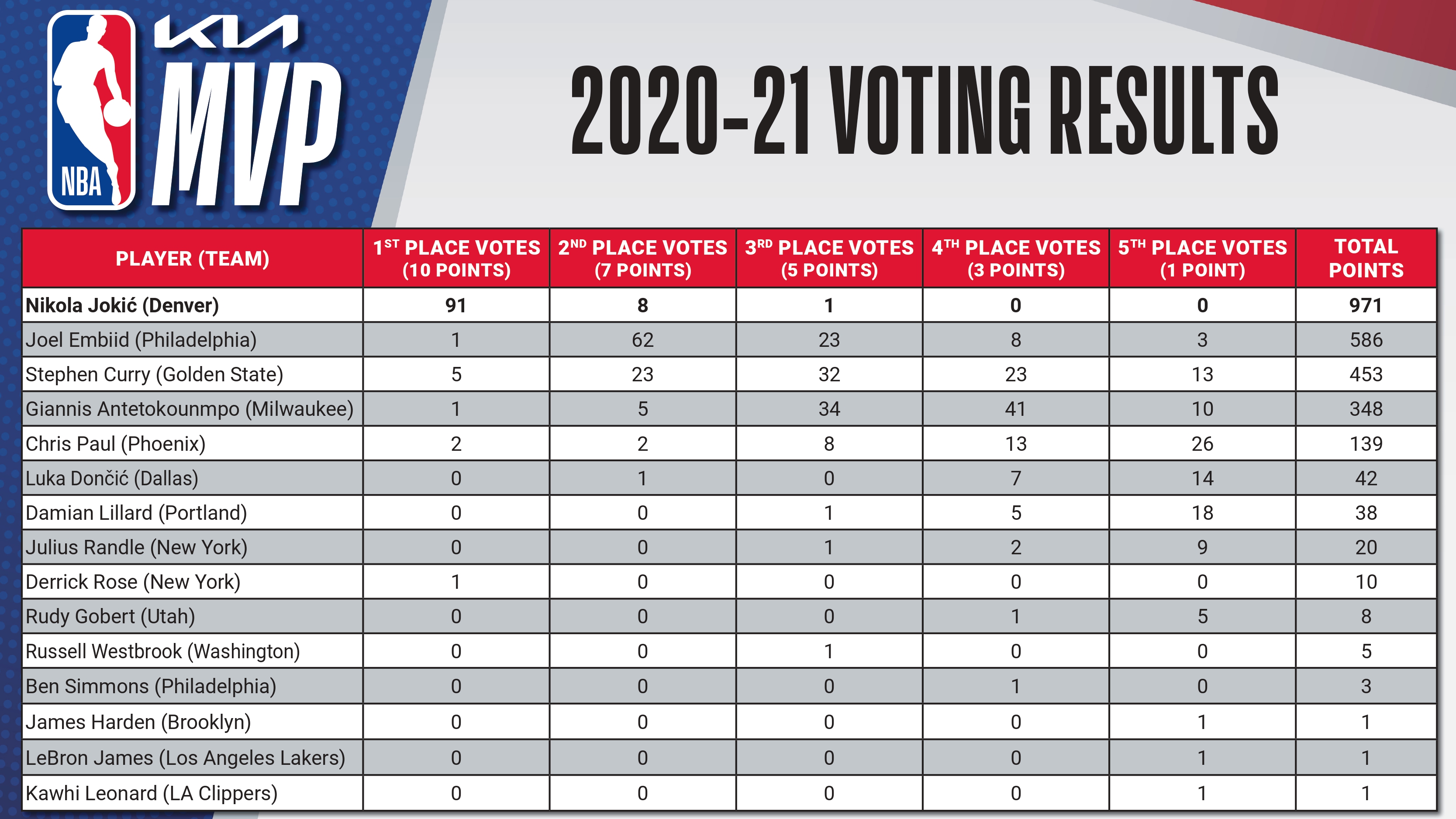 Voting Results: 2020-21 Kia NBA Most Valuable Player Award |
