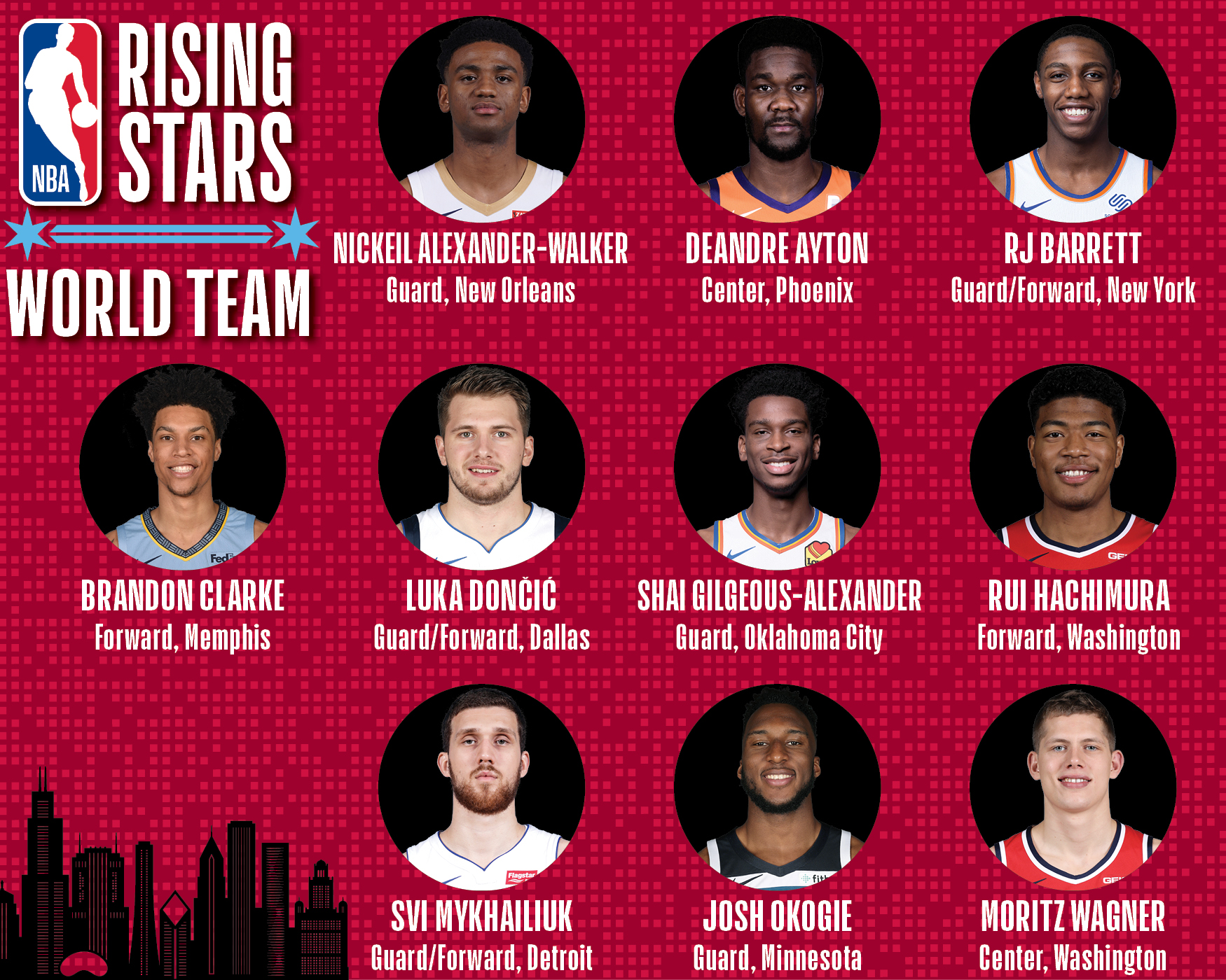 Back To Press Release NBA All-Stars Luka Dončić and Trae Young Headline U.S. vs World Showdown in 2020 NBA Rising Stars All (5) Images (2) Links (3) U.S. Team Rising Stars (Source: National Basketball Association (NBA) | 6 years ago) Share Download HD Download SD Image World Team Rising Stars (Source: National Basketball Association (NBA) | 6 years ago) Share Download HD Download SD Image NBA (Source: National Basketball Association (NBA) | 6 years ago) Share Visit link Link Tickets are available (Source: National Basketball Association (NBA) | 6 years ago) Share Visit link Link Click here (Source: National Basketball Association (NBA) | 6 years ago) Share Visit link Link